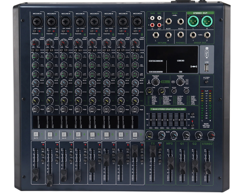 * 8 Channel 8 socket MIC/LINE 2-in-1 line input. Low impedance balanced input. Strong anti-interference, low noise, can be used for wired microphone connection or other sound source input outside the microphone.